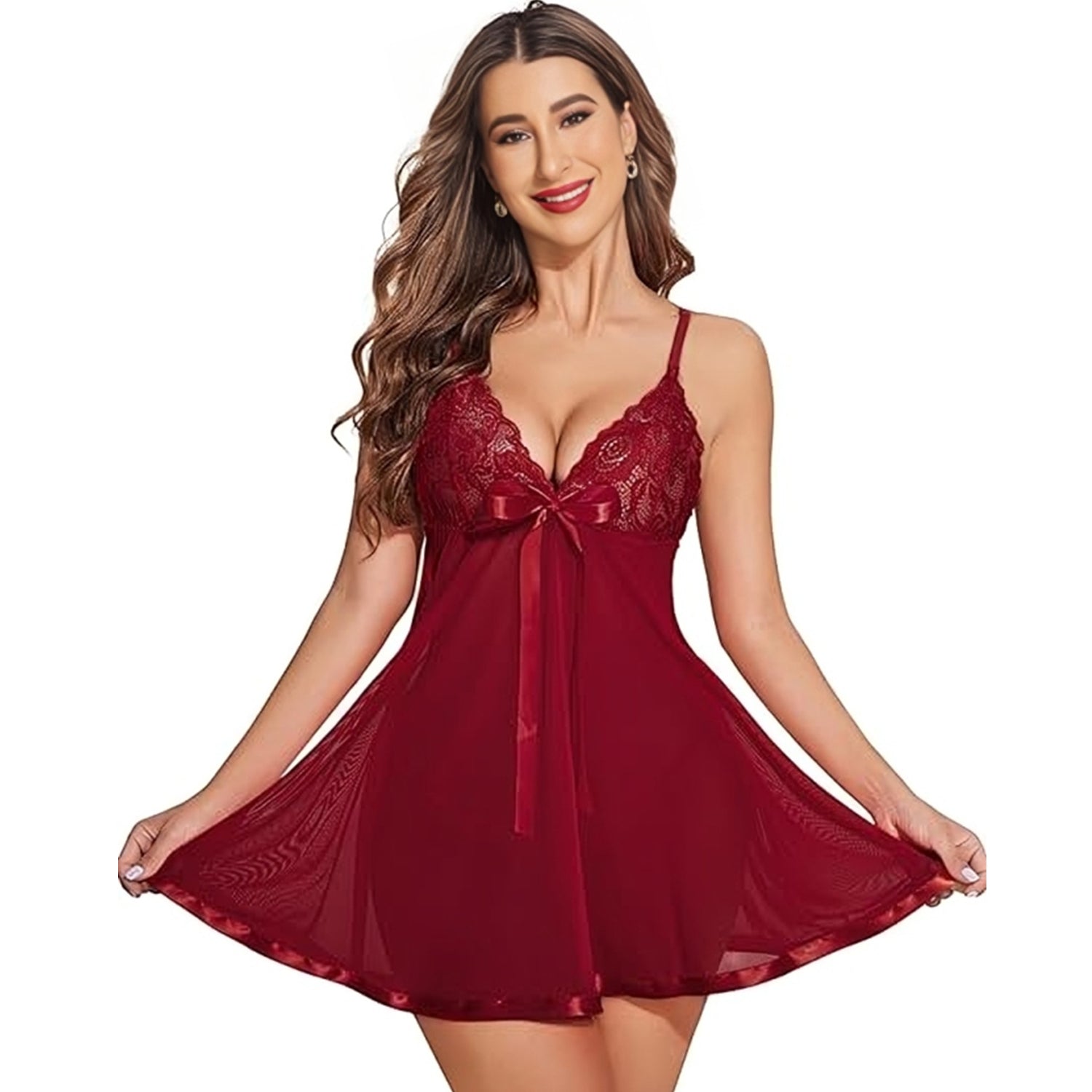 Lace Sheer Babydoll Nightdress with Bow Detail – Elegant Mesh Lingerie